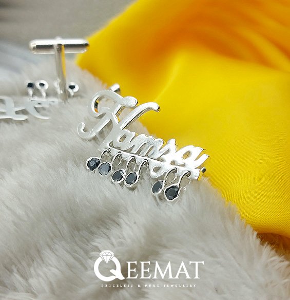 Silver Customized Name Cufflinks with Small Dangling Black Stones