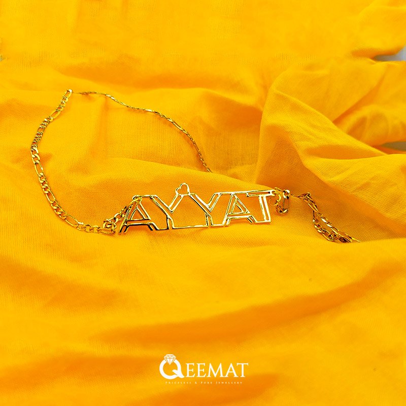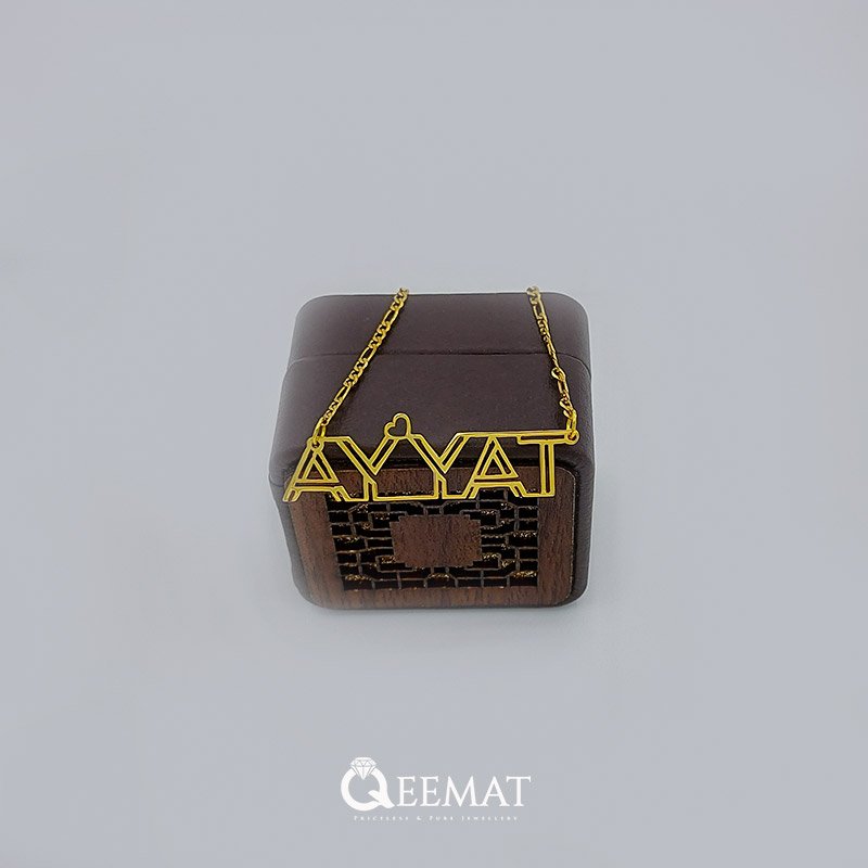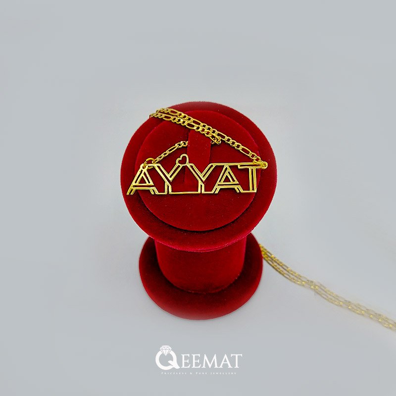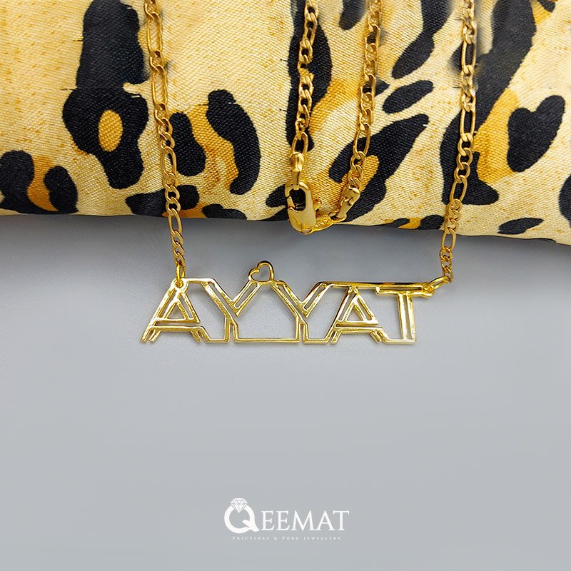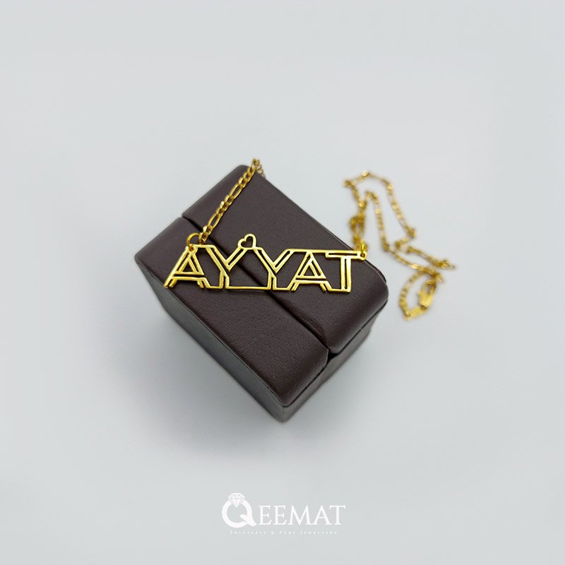 At qeemat.com, order a pendant of your custom name in “Ayyat” style with 24K gold plating or pure silver. We can design your name in new and stylish fonts and enhance your beauty as you will wear it in any festival or party. Pendants such as these are beautifully designed and filled with a glamorous shine. Together with that you can magnify its value by ordering it in 24k pure silver.