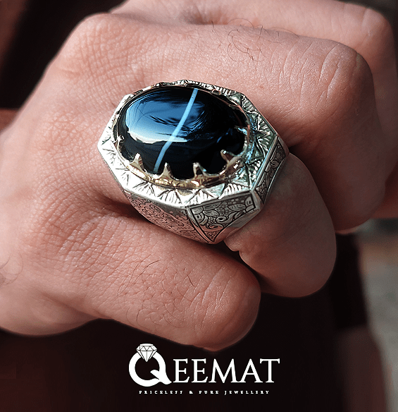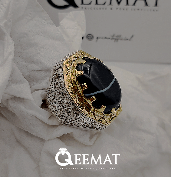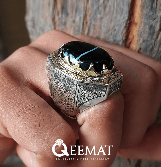 Agate stone is available naturally in many hues and colors. The black and white natural agate stone is popularly known as Soleimani Agate and the ring design which is shown here is especially made for men’s wedding event. This is a handmade octagonal ring with laser engraved design for wedding events.
