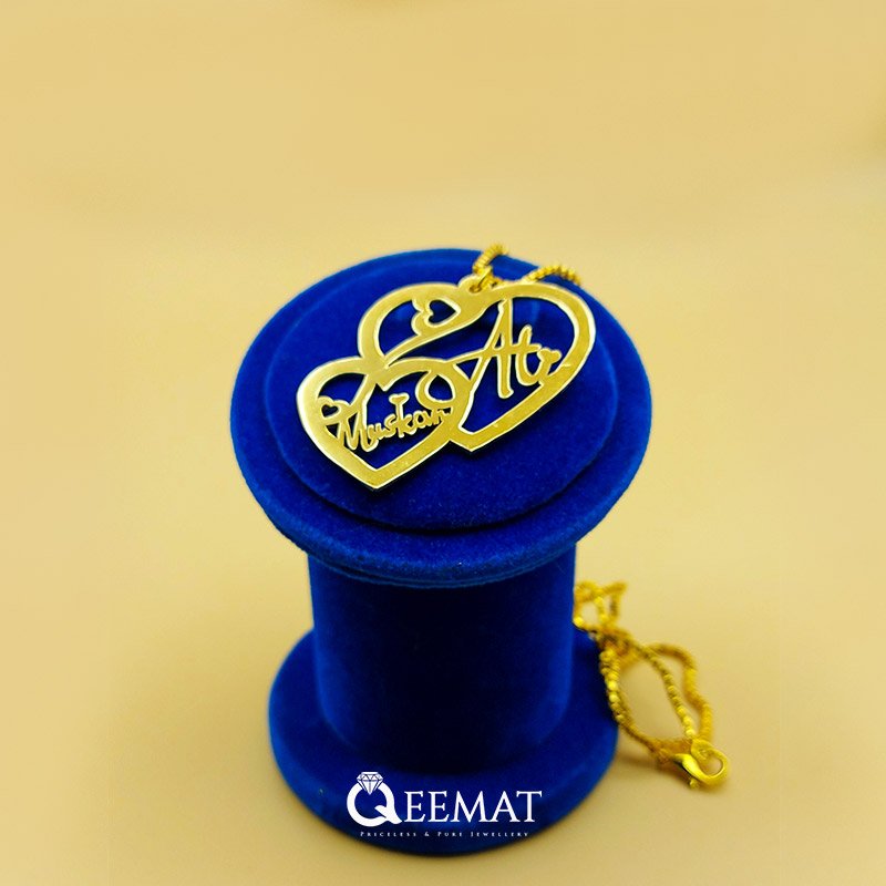 Heart shape necklace with your custom name like the given Ali Muskan pendant style can be ordered online at an affordable price on our website. The shown necklace is gold plated and you can order it in pure gold (23K to 21K gold) as well as in pure silver. There are several fonts and styles that you can choose for your name jewelry here.