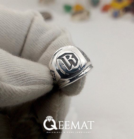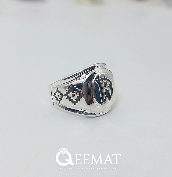 For expressing your unique identity or feelings of love, a name initials ring of sterling silver can be an ideal means. We have inscribed a name initial on top of the ring in head area with a blackish outline making it clearly visible from every angle. Another prominent thing about this ring is its durable framework and a square pattern flanking the shanks. You can order this make-to-order name ring as a birthday gift giving item in any size.