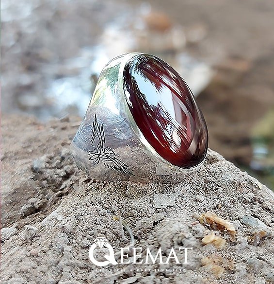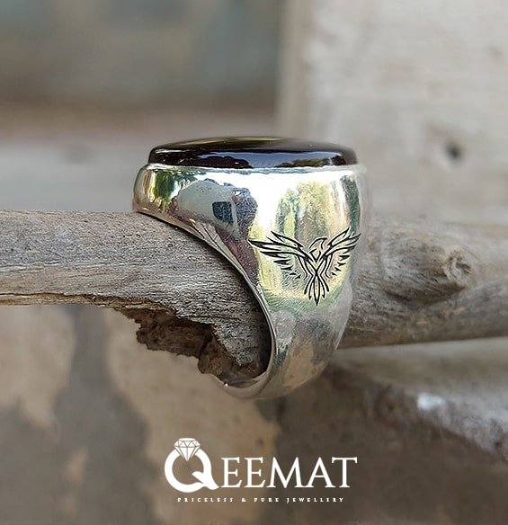 This is a heavy-weighted ring, fitted with Yamini aqeeq. The hoop of the ring is made plain and an eagle shape is inscribed on the shank with special laser technology.