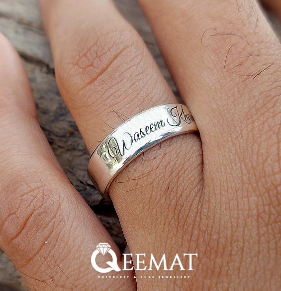 Manifest honor for your near and dear ones by wearing a double name ring band made of pure sterling silver. Mention your name while ordering this name band and describe in the description whether you like to get both names engraved on outer surface or one on each inner and outer surface of the band. We can laser print this handmade silver band with both your first name and last name as well.