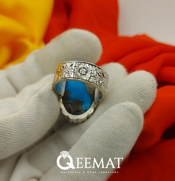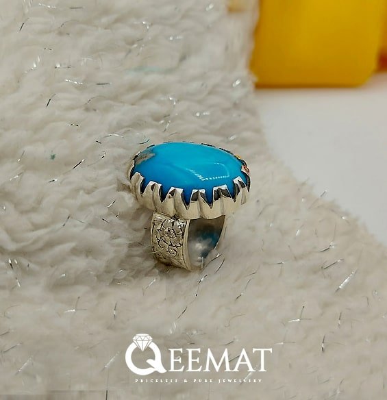 This latest oval turquoise ring has a wonderful contrast of 925 sterling silver and vibrant turquoise gemstone. The visual appeal and patterns on the table of turquoise stone captivates the attention of all the males and females alike. We offer this handmade ring in different qualities of turquoise stone and all the stones are neither treated nor heated. Talking about the ring structure, our ring masters have designed the prongs of this silver ring equally in a new style.