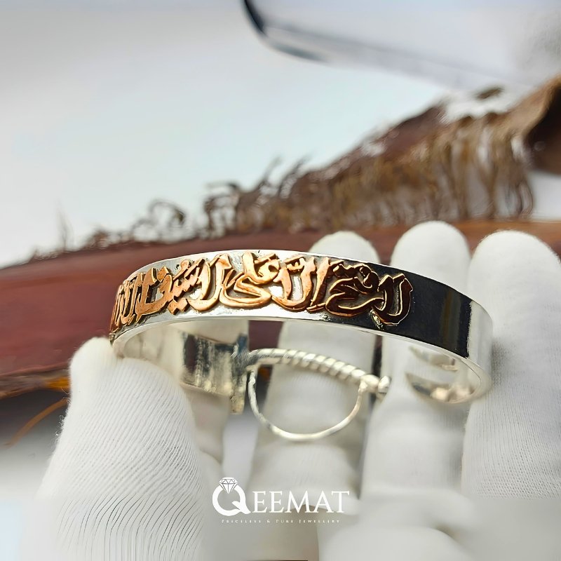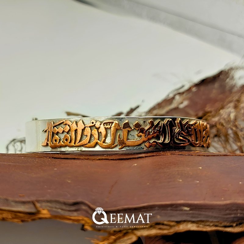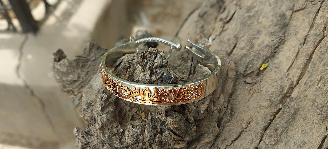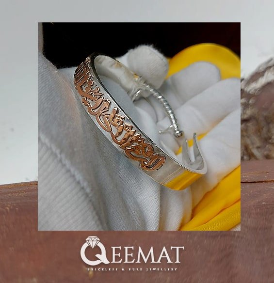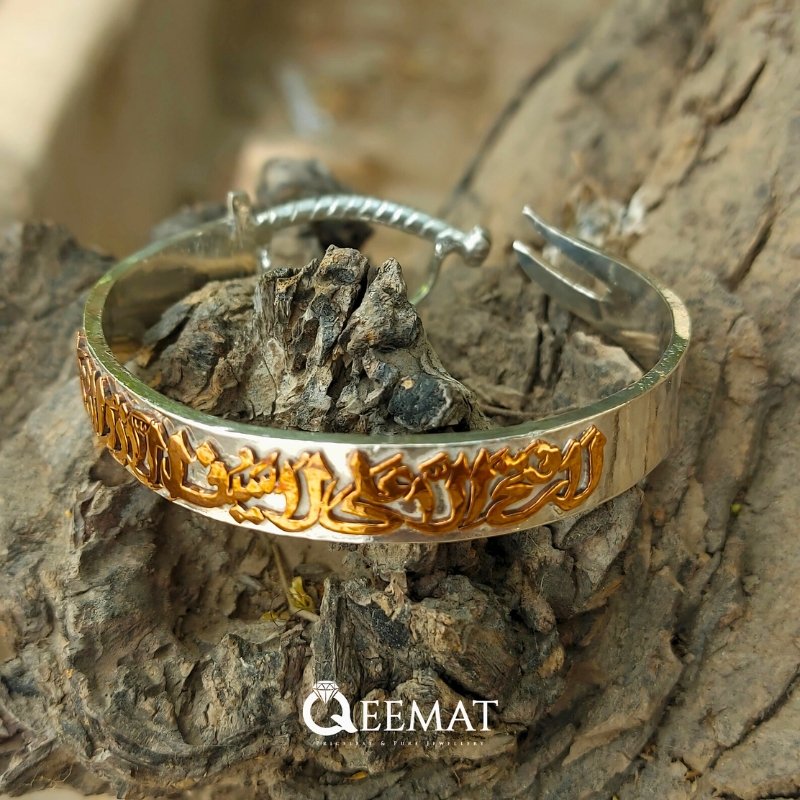 The illuminating part of this shia kada bracelet is that it is made of 925 sterling silver and the verse is fixed on top in embossed style. We have welded a verse of “La Fatah Illa Ali La Saif Ul La Zulfiqar” in golden color and embossed style. This is a hand-cut piece of jewelry to make it look in this stunning design.