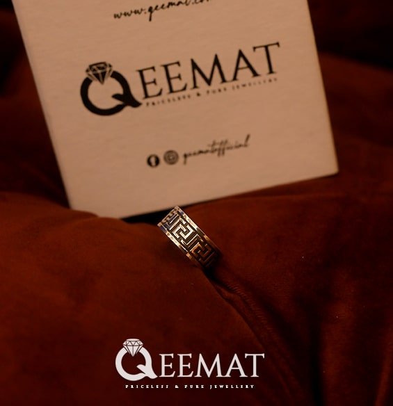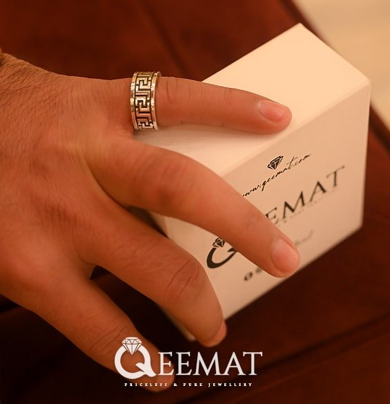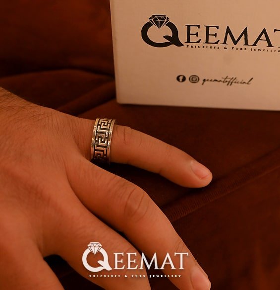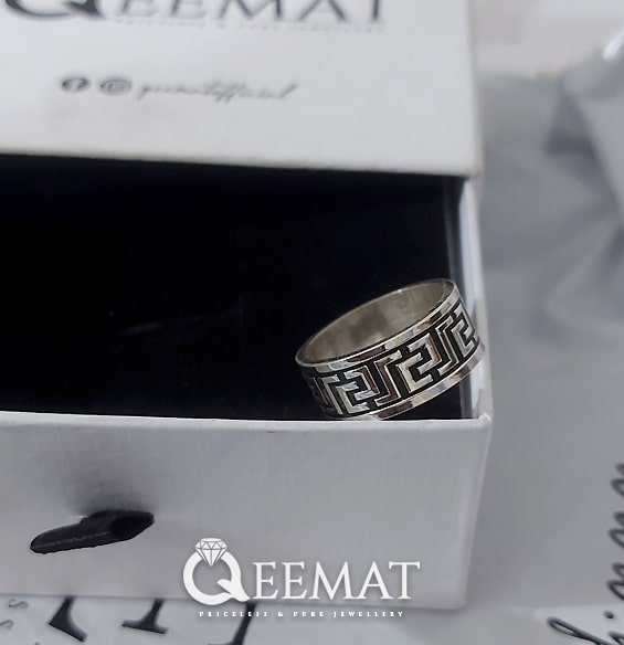 The shine of silver ring band doubles if it is made with 925 sterling silver. This combination of 7.5 percent copper and 92.5 percent silver is chemically a perfect combination to make a glowing ring band. After engraving Versace pattern on this band, we fill the gap with black color called oxidization, to highlight the engraved design. This process gives silver ring band an antique or vintage look.