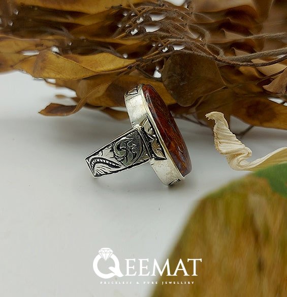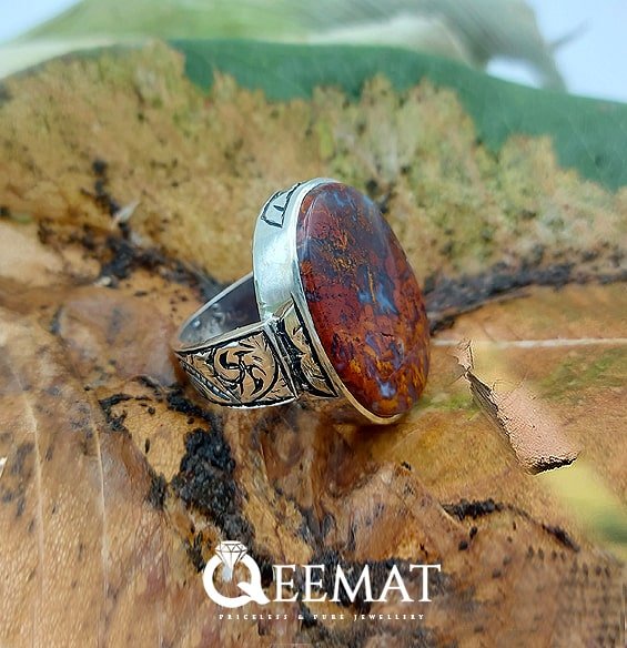 Agate is a type of gemstone that is known for its beautiful, banded patterns and beautiful mixture of colors. Agate stones can be found in a wide range of colors, including shades of blue, brown, green, pink, red, and white, and they are often used in jewelry making. This particular oval shape ring is fitted with a Plume agate stone and a pure metal of silver is used to make this ring. Silver is a popular choice for setting agate stones in rings because it is a relatively inexpensive metal and it complements the colors of the agate well.