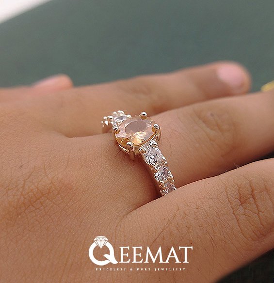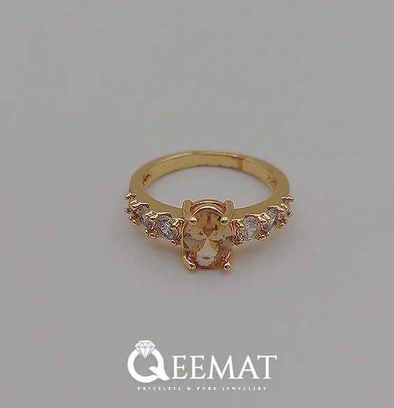 The majority of women like subtle and minimalist ring designs with a medium sized main stone fitted with round smaller ones. Made in 4-pronged design, this ring not only has a lustrous central stone but also 6 small glittering zirconia stones complementing each other to carve out a wonderful pukhraj ring. Yellow sapphire is known as pukhraj among the Asian communities and its prominent feature is its glittering yellow color. We can also make this ring design for you in any finger size.