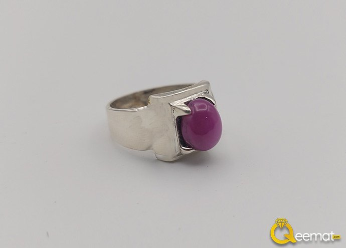 We guarantee the purity of silver in this ring of Ruby star stone. This stone has been cut and polished to create a star-like pattern when viewed from certain angles. This pure silver ring has a square head structure and you can get your name inscribed on its shank area.