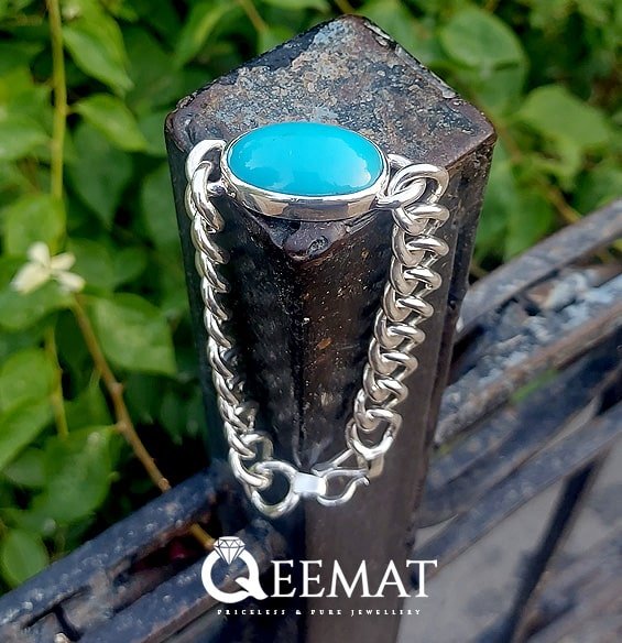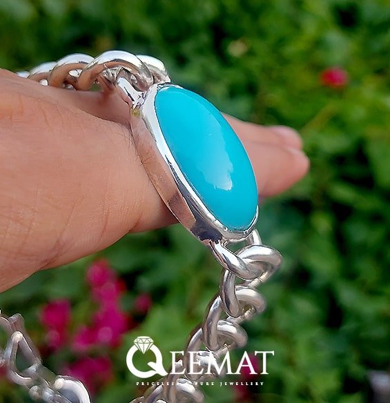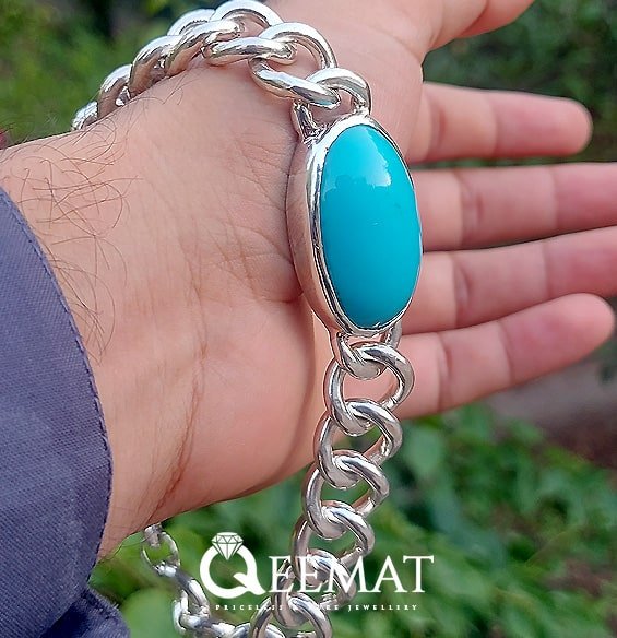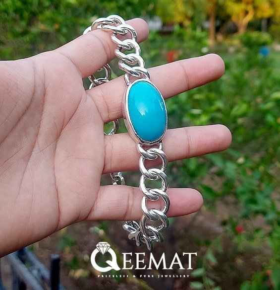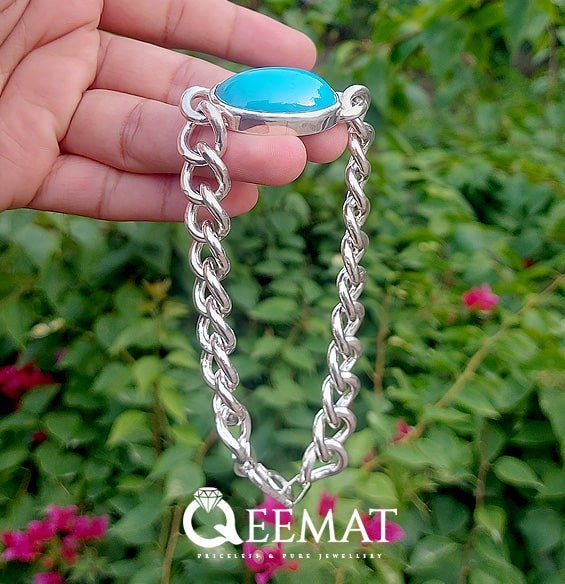 The oval shape turquoise used in this bracelet is natural and it will triplicate the beauty of your wrist. As oval shape stones are popular for their soft curves so our jewelry designers have used an original turquoise colored oval shaped turquoise stone popularly known as Firoza by Indians. You can order this bracelet is different styles of chain and sizes and if you are not sure what weight or size should be ordered, than contact us on our WhatsApp number and our specialist will guide you about these small specifications to buy Salman Khan bracelet online.