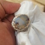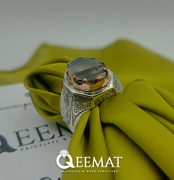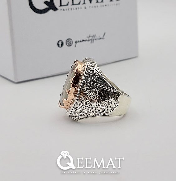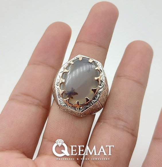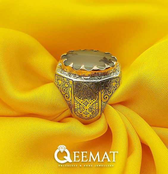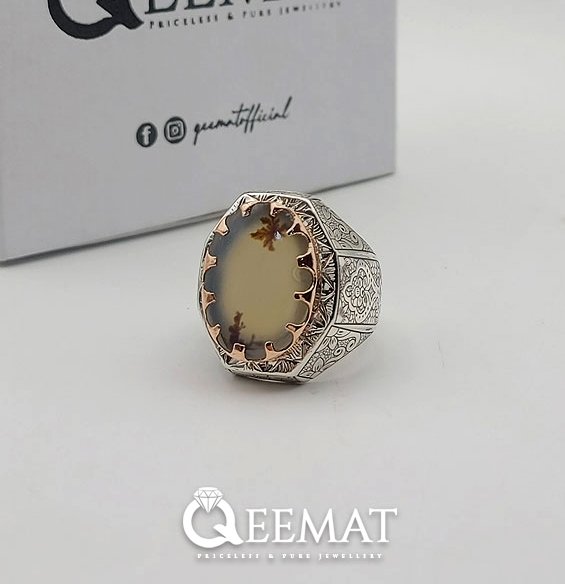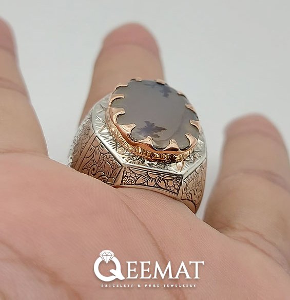 The most amazing visual effects of dendritic agate used in this silver ring for men, are the tree-like natural dendrites. These inclusions are a big source of attraction for those who like to wear a silver ring with dendritic moss agate. The additional notable attribute of this ring is its engraved patterns scattered through the ring. These patterns of moss agate together with the silver-cum-golden structure, gives a princely look to this ring.