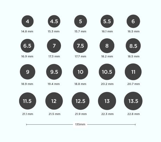 All of our rings are crafted in standard US sizes. View the chart below to see how US sizes map to finger circumference and convert to international sizes. Engagement rings, wedding bands, and fashion rings all follow the same size format.