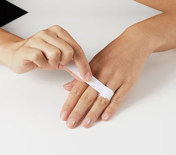 3. Wrap the paper ring sizer snuggly around the base of the intended finger so that the numbers are visible and insert the pointed end through the slit you made in the sizer.